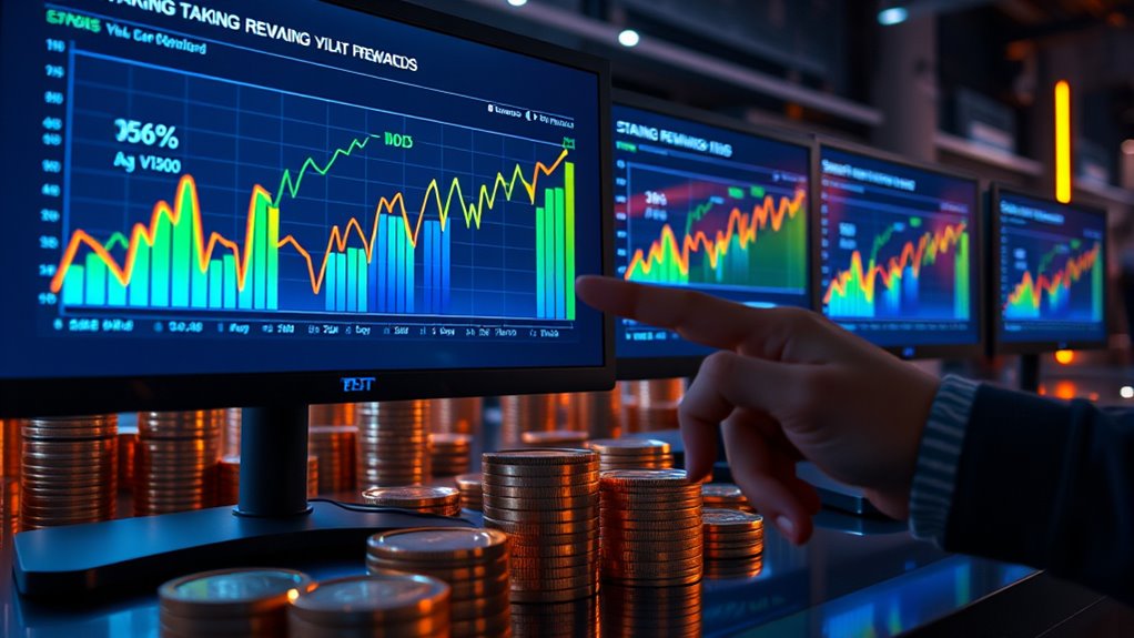 So, while staking offers you the chance to earn passive income, remember it’s not without risks—your assets are still exposed to market swings. You gain yield, yet you also face potential losses. It’s a balancing act: the promise of steady rewards versus the unpredictable nature of crypto markets. By understanding both sides, you can make smarter decisions, turning the allure of passive income into a strategic move rather than a gamble.