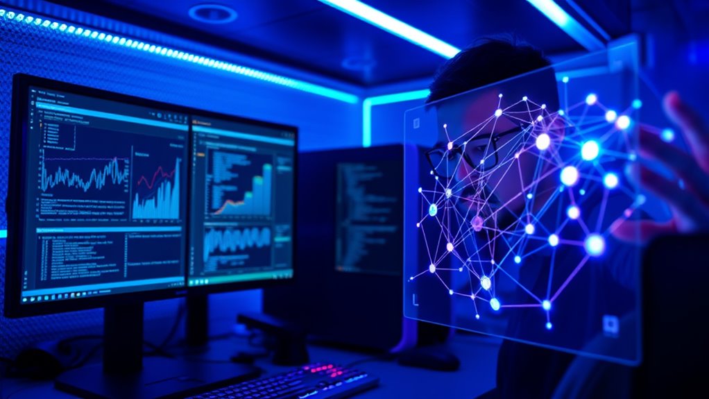 You should be aware that decentralized machine learning faces security risks like data poisoning, where malicious actors inject false data to corrupt models, and model theft, which involves stealing valuable trained models. These threats can compromise the integrity and confidentiality of your system. To mitigate these risks, implement robust validation, encryption, and access controls, ensuring your network remains resilient against malicious attacks and maintains trustworthy AI performance.