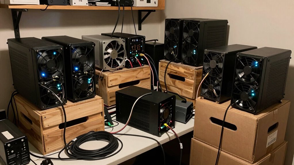 Another frequent mistake is overlooking the importance of ventilation optimization during the initial setup. Many home miners get excited about the hardware and forget to plan for cooling solutions. You might think that simply placing equipment in a well-ventilated room is enough, but without intentional airflow management, hot spots can develop quickly. To prevent this, incorporate ventilation fans, exhaust systems, or even consider creating a dedicated cooling zone for your mining equipment. Using ducting or positioning your mining rigs near windows or vents can help dissipate heat more effectively. Proper airflow management helps maintain optimal temperatures, ensuring your hardware operates at peak efficiency. Additionally, implementing temperature monitoring systems can help you keep track of thermal conditions in real-time and make adjustments as needed. Regularly assessing airflow effectiveness can help you identify and resolve potential issues before they impact performance. Implementing effective airflow strategies can significantly prevent thermal issues before they become severe. Remember, the key to avoiding this common layout error is to *contemplate* ventilation optimization right from the start and to continually assess and improve your airflow design. Incorporating proper airflow management ensures your equipment maintains optimal temperatures, which maximizes performance and extends hardware lifespan. This way, you maximize your equipment’s performance while minimizing risks caused by heat buildup, ensuring your home mining operation runs smoothly and efficiently.
