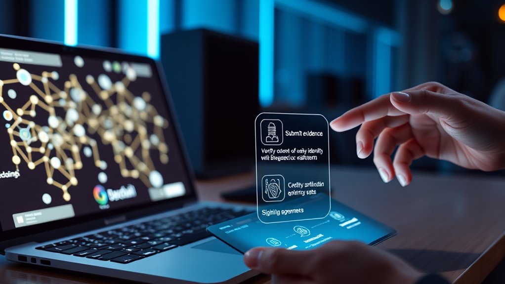 To participate in a blockchain-based dispute resolution platform, start by creating an account on the platform. Link your digital wallet to verify transactions and store tokens securely. When you need to raise a dispute, submit your case along with supporting evidence, which is securely stored on the blockchain for transparency and immutability. Smart contracts will guide the resolution process automatically. Continue exploring to discover how these steps guarantee fair and efficient dispute handling.