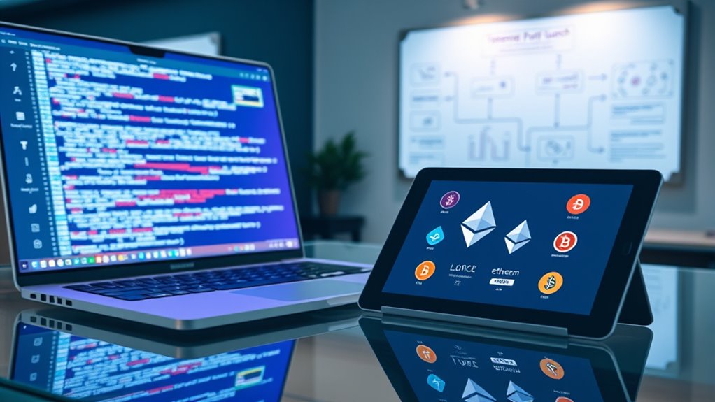 Launching a tokenized fund on Ethereum offers a streamlined way to raise capital and provide liquidity to investors. But before you immerse yourself, you need to guarantee your platform complies with blockchain regulations and standards. Blockchain compliance involves adhering to legal and regulatory frameworks that govern digital assets, such as securities laws and anti-money laundering (AML) policies. You must design your token structure and fundraising process to meet these standards, avoiding potential legal pitfalls. Partnering with legal experts familiar with blockchain regulations can help you craft compliant token offerings and establish transparent investor disclosures. Once compliance is addressed, the technical foundation becomes critical. Smart contract auditing plays a crucial role here, ensuring your code is secure, reliable, and free from vulnerabilities. An unvetted smart contract can be exploited, risking investor funds and damaging your reputation. Consequently, engaging professional auditors to review your smart contracts is essential. They meticulously examine your code for bugs, security flaws, and potential exploits, giving you confidence that your contracts will function as intended when deployed on Ethereum. The auditing process often involves multiple layers of testing, including formal verification, to confirm that your contracts handle transactions correctly and securely. After completing these steps, you’re ready to develop your tokenized fund. You’ll need to create a smart contract that defines the fund’s structure, including token issuance, investor rights, and governance mechanisms. This contract acts as the backbone of your platform, automating processes like capital collection, profit distribution, and voting. Guaranteeing your smart contract is thoroughly audited before deployment minimizes risks and instills investor trust. Additionally, understanding creative practice can foster innovative solutions during the development process, encouraging unique approaches to smart contract design and fund management. Once deployed, you’ll want to implement user-friendly interfaces and secure wallets to facilitate seamless participation. Remember, transparency is key; providing clear information about your fund’s objectives, fee structure, and compliance measures reassures investors and encourages trust. Promoting your tokenized fund involves engaging with your target audience through marketing channels, highlighting your adherence to blockchain compliance and the security measures taken via smart contract auditing. By prioritizing legal adherence and rigorous security checks, you lay a solid foundation for your tokenized fund’s success on Ethereum. This approach not only mitigates risks but also creates a trustworthy environment that appeals to a broader investor base. Ultimately, launching a tokenized fund requires careful planning, compliance, and technical diligence, but with these elements in place, you can open up new capital avenues and liquidity options in the rapidly evolving blockchain landscape.