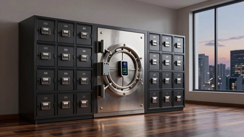 Setting up a self-custody room usually costs between $5,000 and $20,000, depending on vault design and security features. You’ll need a secure vault, access control systems like biometric locks, and surveillance equipment. The cost varies based on the complexity of access control and the quality of security measures you select. Planning carefully guarantees your self-custody room offers reliable protection without overspending.