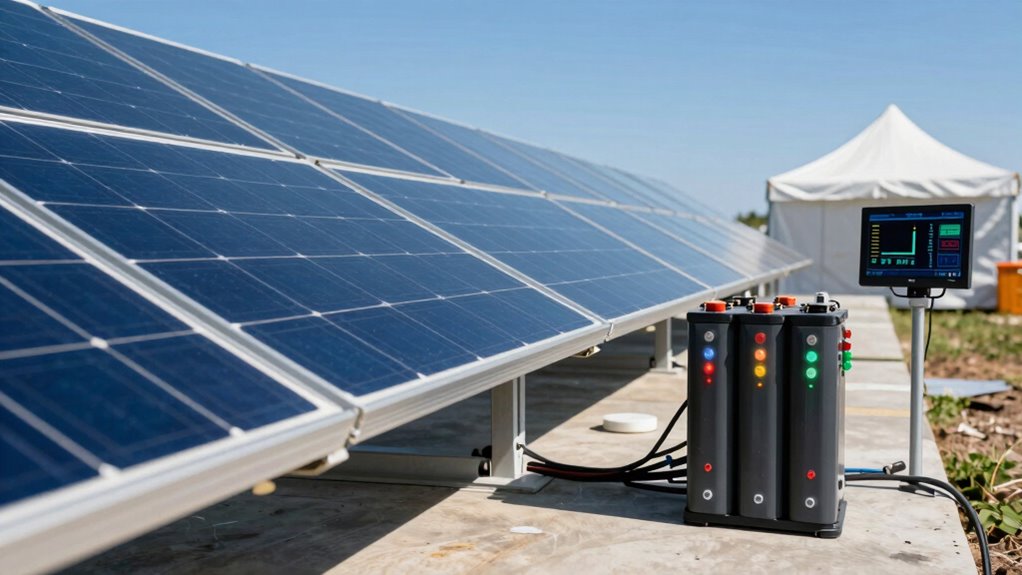 Balancing battery capacity and inverter sizing is essential. An undersized inverter will restrict your system’s ability to handle peak loads, while insufficient battery capacity might not provide enough backup time. Both components must be matched to your specific load profile, considering both average and maximum power demands. Additionally, don’t forget to factor in the efficiency of your system components; not all stored energy makes it to your miners. Properly sizing your solar backup system involves detailed calculations and understanding your mining operation’s unique power profile. By carefully selecting the right battery capacity and inverter size, you guarantee reliable operation during outages, protect your investment, and keep your mining activity profitable without interruption.