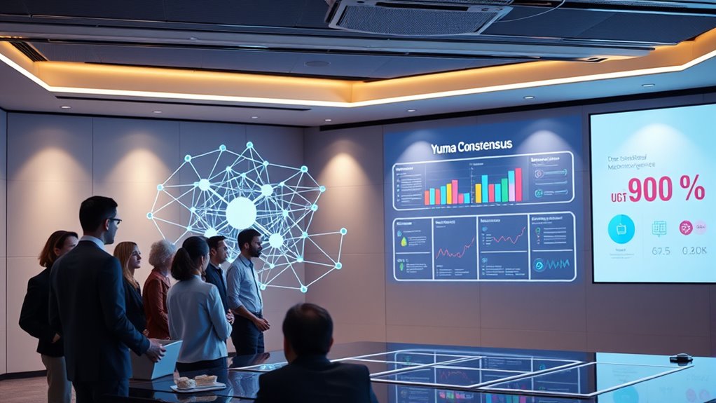The Yuma Consensus creates a token economy that aligns incentives to promote trustless collaboration in decentralized machine intelligence. By rewarding data providers and validation nodes with tokens, it encourages honest contributions while discouraging malicious behavior through staking and slashing mechanisms. Blockchain technology guarantees transparency and accountability, making the network resilient and scalable. Understanding these core principles helps you see how the economy sustains a robust, secure, and growing decentralized AI ecosystem—more details await your exploration.