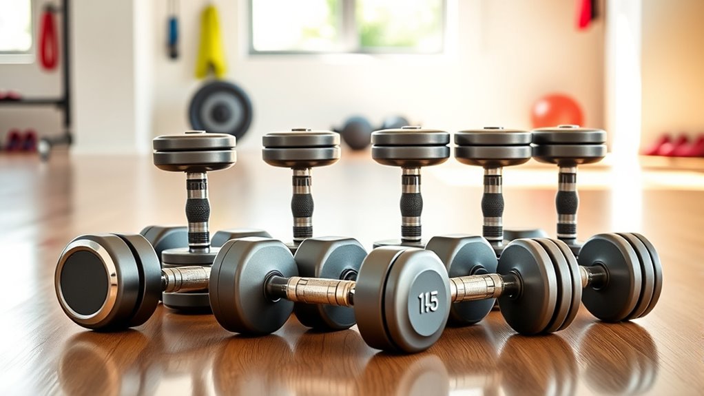 Adjustable dumbbells remarkably boost workout versatility by allowing me to quickly switch weights, enabling a wide range of exercises from bicep curls to squats. I love how I can tailor my workout intensity without swapping out equipment, saving time and space. They’re perfect for customizing routines and progressing gradually. With adjustable dumbbells, I can easily adapt my workouts to target different muscle groups, making my fitness more dynamic and efficient.