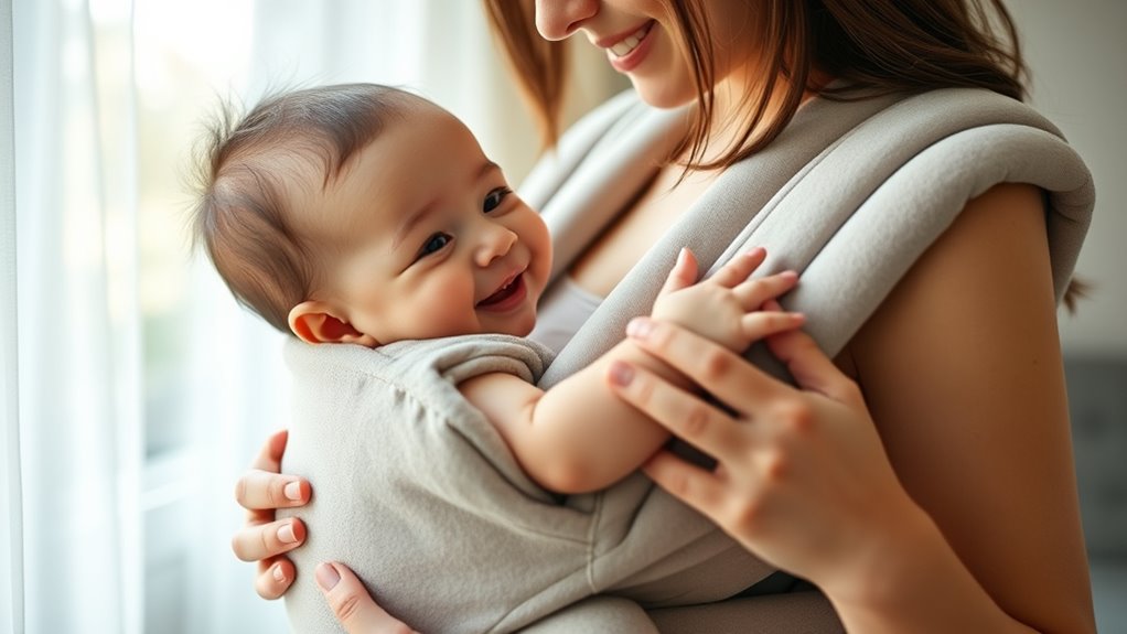Choosing a baby carrier that’s easy to use can make a big difference in your daily routines. Look for carriers with adjustable straps and quick-release buckles so you can put them on and take them off effortlessly, regardless of your experience. Clear instructions or tutorial videos are also invaluable—they help guarantee you use the carrier correctly, which is vital for your baby’s safety and comfort. Features like single-clip fastening systems simplify securing your little one, reducing hassle. The ability to quickly adjust the fit or switch carrying positions is a real time-saver, especially when multitasking. Additionally, lightweight, breathable fabrics and a simple design make handling the carrier more comfortable and straightforward during busy days. These features combine to make caregiving smoother and more enjoyable.