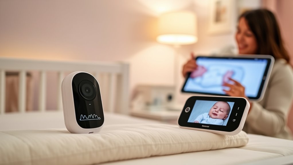 Have you ever wondered how to get a clear view of your baby even in the dark? High-quality video monitors with 720p or 1080p resolution make it easy to see every detail clearly. Night vision, typically using infrared LEDs, lets me check on my baby in darkness without disturbing sleep. Two-way audio is a game-changer—being able to talk and soothe my baby remotely provides peace of mind. Some monitors also feature noise and cry detection sensors that send instant alerts if needed. Advanced models use encryption to keep streams private and interference-free, ensuring my family’s data stays secure. Overall, high-quality video and audio features help me stay connected and confident, no matter the time or place.