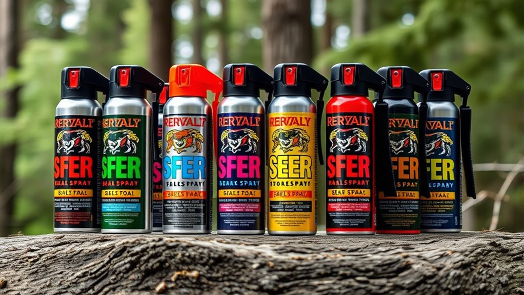 When exploring bear country, I recommend choosing from the top bear sprays like SABRE Frontiersman MAX, UDAP Pepper Power, and Counter Assault, which offer ranges up to 40 feet, high capsaicinoids, and safety features like flip-top covers and holsters. These sprays are lightweight, durable, eco-friendly, and designed for quick access in emergencies. If you want to find the best option for your adventures, there’s more info on what makes these sprays so reliable.