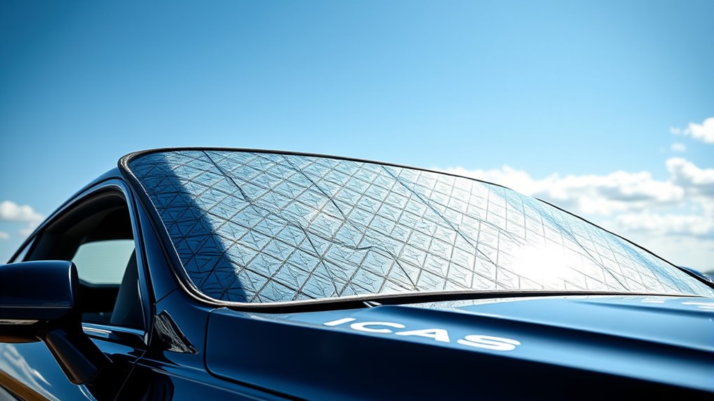 Looking for the best car sun shades to keep your vehicle cool and protect your interior? I recommend options that block up to 99% of UV rays, reflect heat, and are made from durable, easy-to-install materials like polyester with reflective coatings. Whether you prefer foldable designs, magnetic attachments, or universal fits, there’s something for every vehicle and need. If you want to find out which models stand out and why, keep going to get all the details.