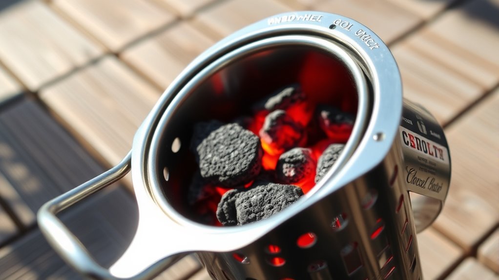 Choosing a charcoal chimney starter that’s easy to use hinges on its design features. Look for models with intuitive components like a large handle for a secure grip and a simple loading area that makes filling straightforward. An efficient airflow system, including vented bases and air vents, ensures quick, even lighting with minimal effort. Ergonomic features such as stay-cool handles and safety shields add comfort and safety during use, especially when handling hot equipment. Lightweight construction and balanced design make lifting, pouring, and repositioning easier, reducing fatigue. Additionally, clear instructions or minimal assembly requirements help beginners get started without frustration. Overall, a user-friendly chimney starter combines thoughtful design with practical features to simplify the lighting process and enhance your grilling experience.