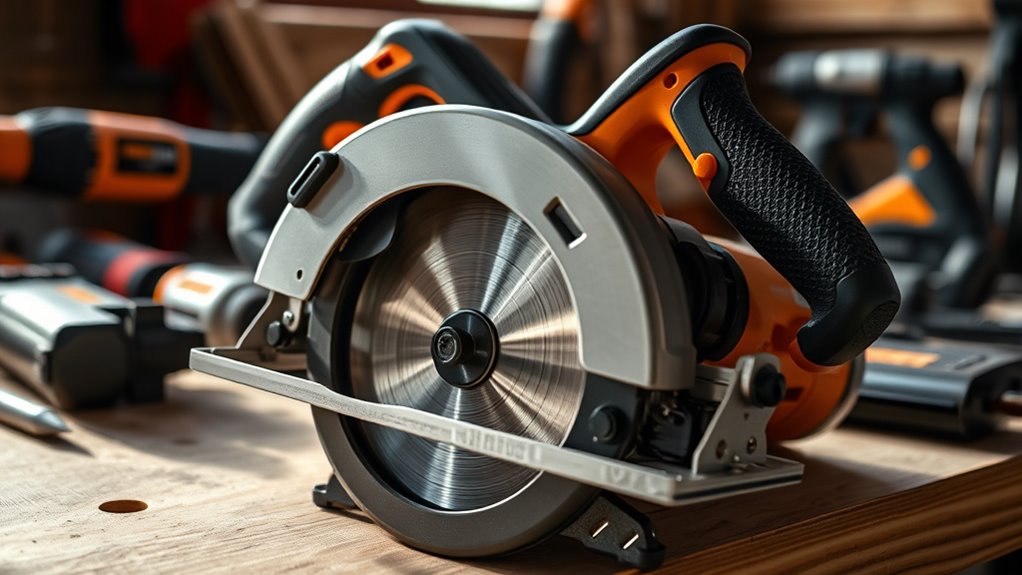 Choosing the right circular saw depends heavily on understanding its motor type and power. Brushless motors are generally better—they’re more efficient, last longer, and extend battery life, making them ideal for cordless models. The motor’s power, measured in amps for corded saws or volts for cordless ones, directly impacts performance. Saws with higher amperage, like 15 or more, can cut through denser materials with ease. Brushless motors also use electronic controls to optimize speed and torque, resulting in smoother cuts and less heat buildup. This design reduces wear and tear, ensuring your saw stays reliable over time. Ultimately, selecting a saw with the right motor type and power rating means better performance, durability, and efficiency for your projects.