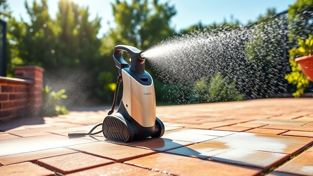 Power and pressure levels are key factors that determine how effectively an electric pressure washer can clean different surfaces. Higher PSI (pounds per square inch) means more cleaning power; most household models range from 1500 to 4000 PSI. GPM (gallons per minute) measures water flow, and higher GPM speeds up cleaning and improves results. Adjustable pressure settings let you tailor the power, protecting delicate surfaces while tackling tough stains. Combining a high PSI with sufficient GPM ensures deep, efficient cleaning, especially for stubborn dirt and grime. To choose the right washer, it’s crucial to understand the maximum and rated PSI, as these figures reveal a unit’s true cleaning capacity and suitability for your specific tasks. This knowledge helps you find a model that balances power and versatility.