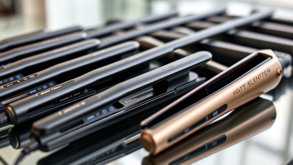 Ensuring even heat distribution is vital for achieving consistent styling results and preventing damage. When heat is spread uniformly across the plates, all hair strands receive the same temperature, minimizing hot spots that can cause burns or uneven curls. Advanced materials like ceramic, titanium, or infrared technology often promote better heat spread compared to standard models. Proper plate design, such as floating or beveled plates, helps maintain consistent contact with your hair, enhancing uniformity. Variations in heat distribution can leave sections frizzy or unstyled, making evenly heating essential. Regular maintenance, like cleaning the plates and checking for warping, also supports ideal heat transfer over time. By prioritizing these factors, you guarantee a smoother, more effective styling experience.