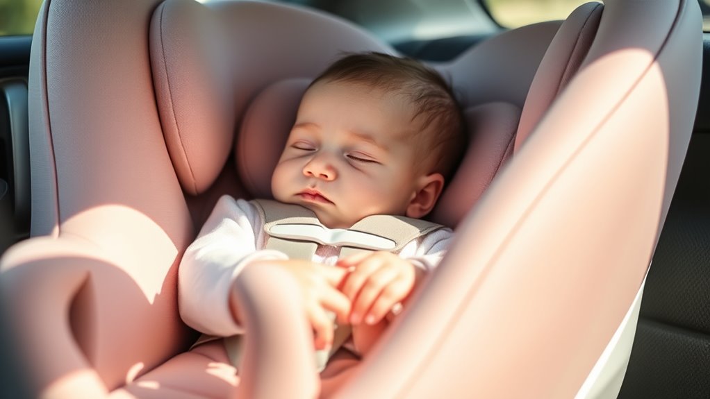 Ensuring your infant’s comfort starts with selecting a car seat that offers ample padding and plush fabrics. Well-designed padding provides cushioning that prevents pressure points during long rides, keeping your baby comfortable and relaxed. Soft, plush fabrics and memory foam padding enhance comfort, especially for your baby’s sensitive skin and fragile body. Removable and washable padding makes cleaning easy, guaranteeing a hygienic environment. Additional head and body support cushions help maintain proper posture and a secure fit, reducing unnecessary movement. Plus, well-padded seats can absorb impact forces, offering extra protection in case of a collision. Prioritizing comfort and padding ensures your little one stays cozy and safe, making every trip more enjoyable for both of you.