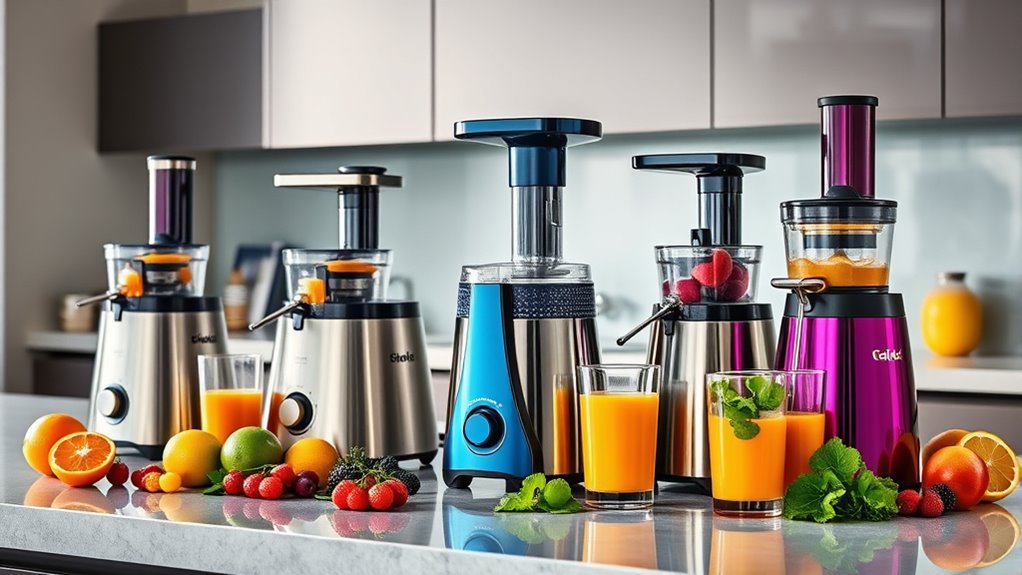 If you’re after the best juicers for fresh, nutritious juice in 2025, I recommend checking out options like the Nama J3 Compact Cold Press Juicer and Ninja NeverClog Cold Press Juicer, which offer wide feeds and high nutrient retention. For quick results, centrifugal models like the Qcen Juicer are great. Each has unique features suited for various needs, whether you want versatility, speed, or maximum nutrients. Keep exploring to find the perfect match for your juicing routine.