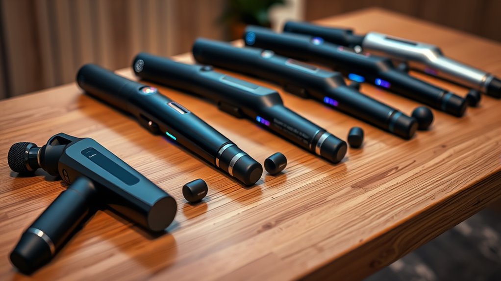 A variety of massage heads considerably enhances a massage gun’s versatility, allowing me to target different muscle groups and pain points more effectively. With options like ball, bullet, flat, and fork heads, I can customize treatments for deep tissue, trigger points, or surface muscles. Multiple attachments make it easier to adapt the massage to specific areas and muscle conditions, providing personalized relief. Quick-changing, secure threading or snap-on designs save time and guarantee consistent pressure during use. Some models even offer specialized heads, like heated or cold attachments, to further customize therapy—whether I want to reduce inflammation, relieve pain, or simply relax. Overall, a wide attachment selection is essential for maximizing the effectiveness and versatility of my massage routine.