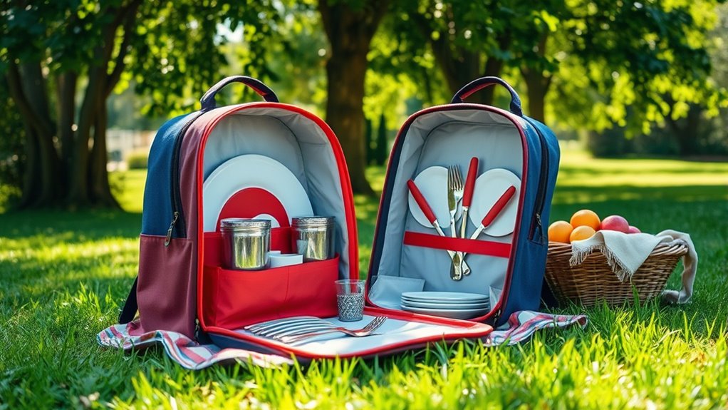 Choosing a picnic backpack with the right accessories can make outdoor dining more convenient and enjoyable. I look for sets that include all the essentials—knives, forks, spoons, and plates—so I don’t need to carry extra items. Built-in extras like bottle openers, cheese knives, and salt and pepper shakers add convenience and elevate the experience. A waterproof picnic blanket or ground cloth is also a must, ensuring comfortable seating on various terrains. I pay attention to specialized compartments for wine glasses, water bottles, and insulated cooler sections, which keep beverages secure and at the right temperature. Finally, I prefer accessories made of durable, lightweight materials like stainless steel, plastic, or bamboo, so they last and are easy to handle outdoors.