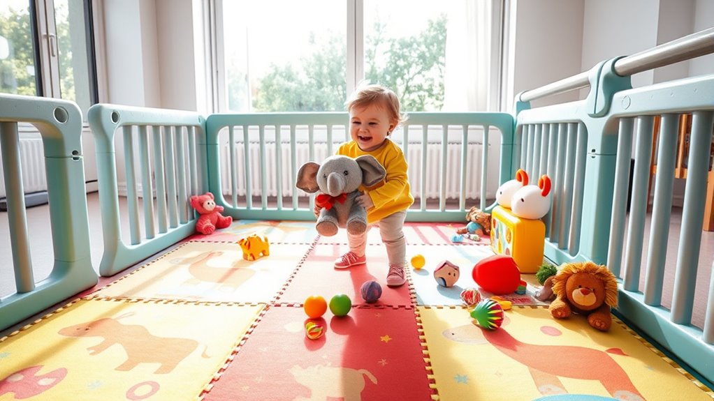 Choosing the right playpen makes all the difference in your child’s safety and happiness. I remember a friend who switched to a spacious, mesh-sided playpen, and her toddler’s playtime improved so much—more freedom and less worry. Whether you opt for a portable playard or a larger yard, just remember to contemplate size, safety features, and ease of use. Trust me, a well-chosen playpen creates a safe, fun space where your little one can thrive!