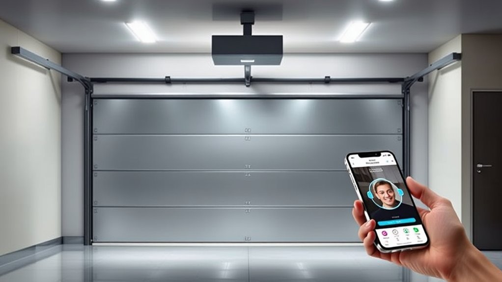 Security features are crucial when evaluating smart garage door openers because they directly protect your home from unauthorized access. I look for models that use rolling code technology, like Intellicode or Security Plus 2.0, which change codes with every use, making hacking much harder. Safety sensors or beams are essential—they detect obstructions and prevent accidental door closures, enhancing safety and security. Encrypted Wi-Fi communication and secure app controls are must-haves to keep remote access protected from intruders. I also consider systems that support PIN or access codes for temporary or guest use, adding an extra layer of security. Finally, real-time alerts and activity logs help me monitor door status and spot suspicious activity immediately, giving me peace of mind.