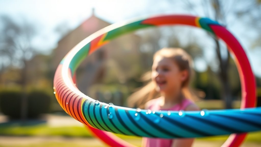 Durability and material quality guarantee your weighted hula hoop can handle frequent use, but considering noise and portability can make a big difference in how you incorporate it into your routine. A quieter hoop, producing below 40 decibels, allows you to workout without disturbing others—ideal for shared spaces. Foam padding and silent mechanisms help reduce sound during spins. Portability is just as important; foldable or collapsible designs make storage and transport effortless, so you can take your workout anywhere. Lightweight construction, with detachable links or compact frames, further simplifies carrying and setup. When selecting a hoop, think about how easily it disassembles and whether it fits into your daily routine or travel plans. These features can turn your workouts into seamless, on-the-go fitness sessions.